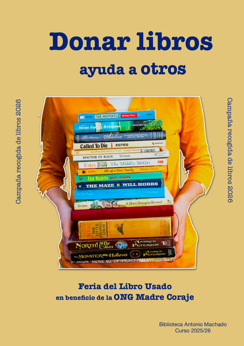 Estimada comunidad educativa: Después de la experiencia del curso pasado, nos hemos vuelto a animar el equipo de biblioteca del IES Antonio Machado a repetir la feria del libro usado y de ocasión a beneficio de la ONG «Madre Coraje» que se celebrará del 14 al 16 de abril, entre Semana Santa y Feria. Para ello, pedimos su colaboración en la …