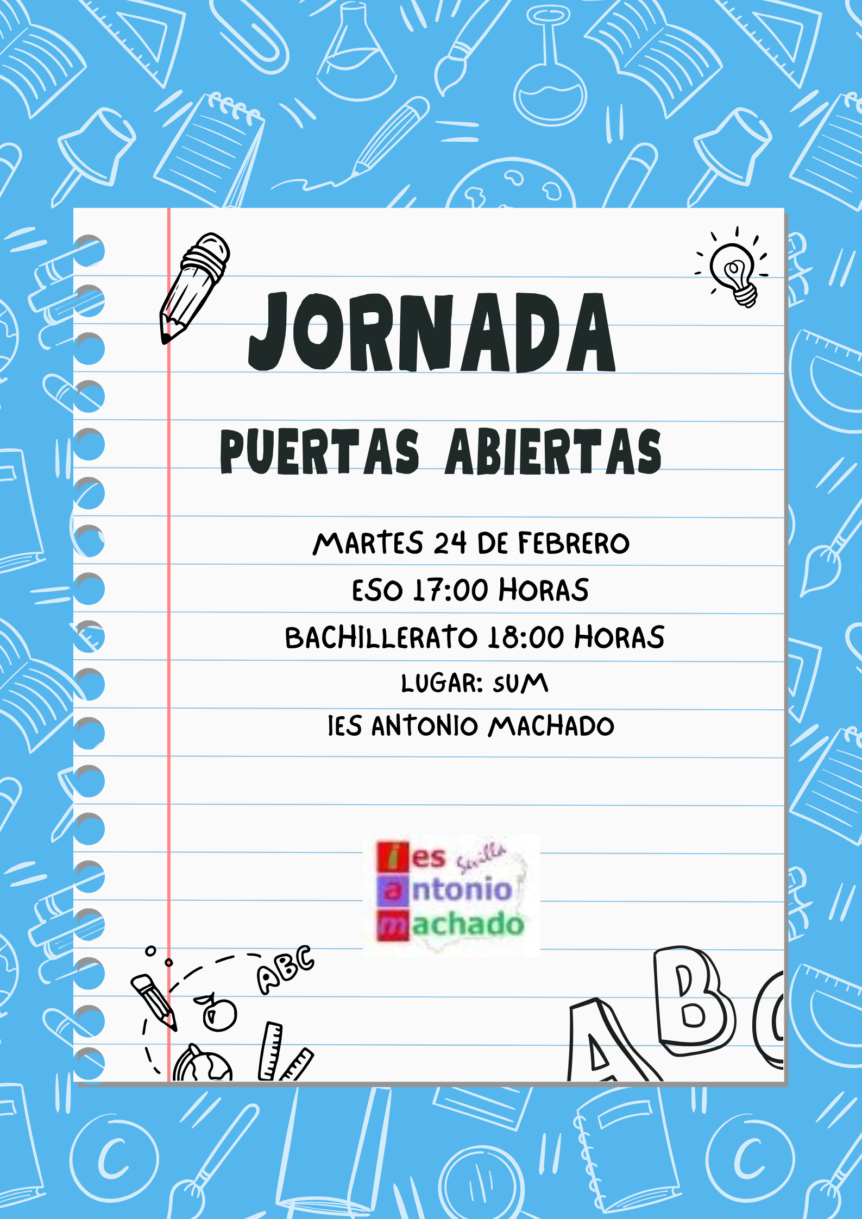 El próximo 24 de febrero nuestro centro celebrará en el SUM las jornadas de puertas abiertas para aquellas familias de alumnado de nuevo ingreso de ESO y/o bachillerato que quieran acercarse para conocer nuestro instituto.
