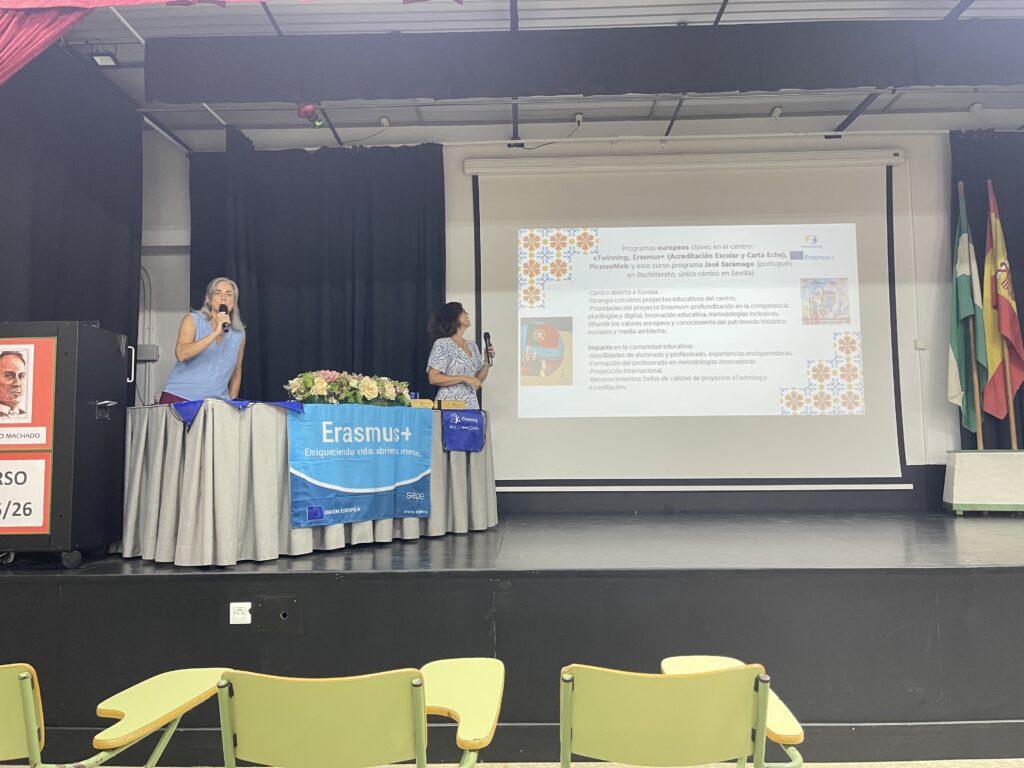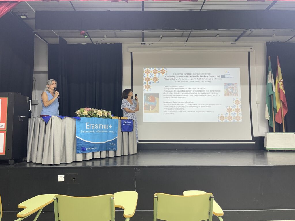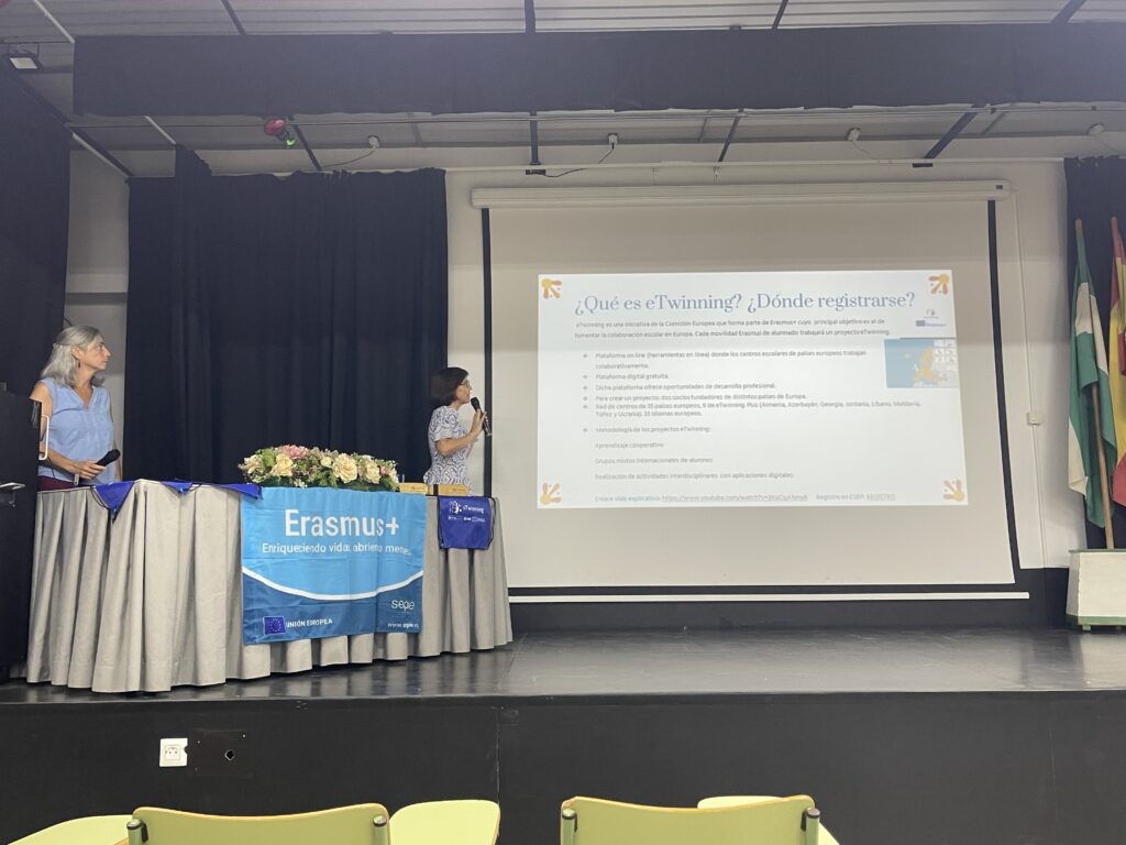 Nuestras compañeras María Ángeles Bazalo y Yolanda Jara, ambas embajadoras de eTwinning y parte de nuestro equipo Erasmus+ nos explicaron el formidable trabajo que desde el instituto se está desarrollando en el ámbito de la internacionalización, proyectos Erasmus+ y eTwinning.